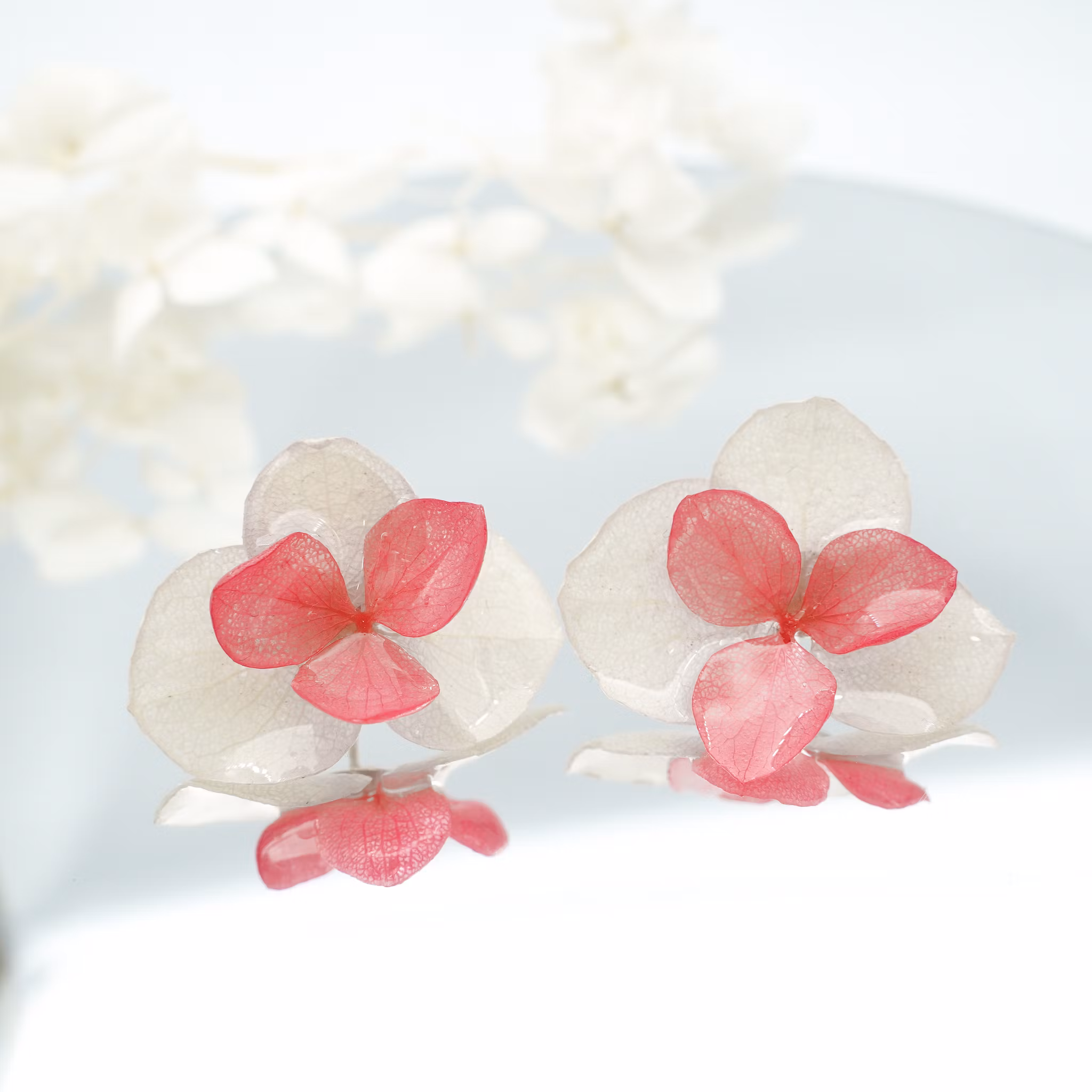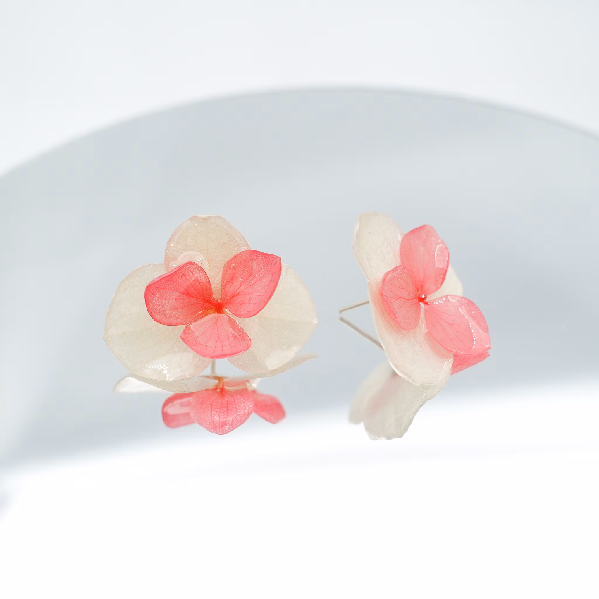 Disse øresmykkene er laget av ekte hortensiablomster, preservert i UV-resin og montert på allergivennlige ørestikker belagt med ekte sølv. Amplia er en større variant av Hortensia Alv, laget av de største hortensiablomstene, og gir et mer markert og fyldig uttrykk. Resinen gir blomstene glans og fremhever detaljene i hver enkelt.