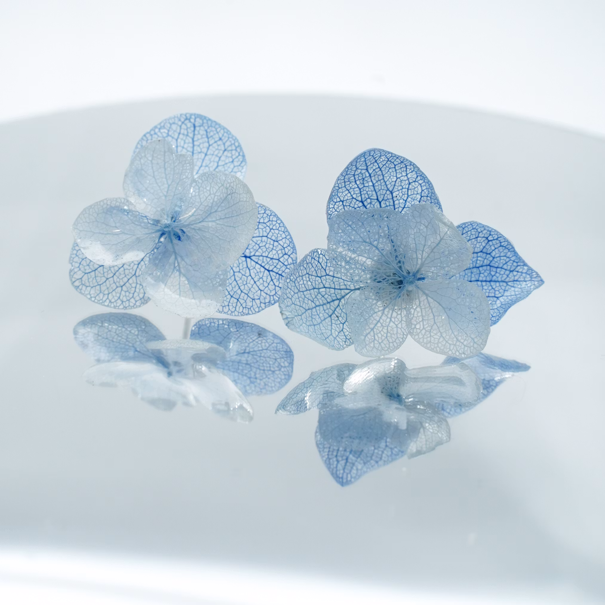 Disse øresmykkene er laget av ekte hortensiablomster, preservert i UV-resin og montert på allergivennlige ørestikker belagt med ekte sølv. Resinen gir blomstene glans og fremhever detaljene i hver enkelt.