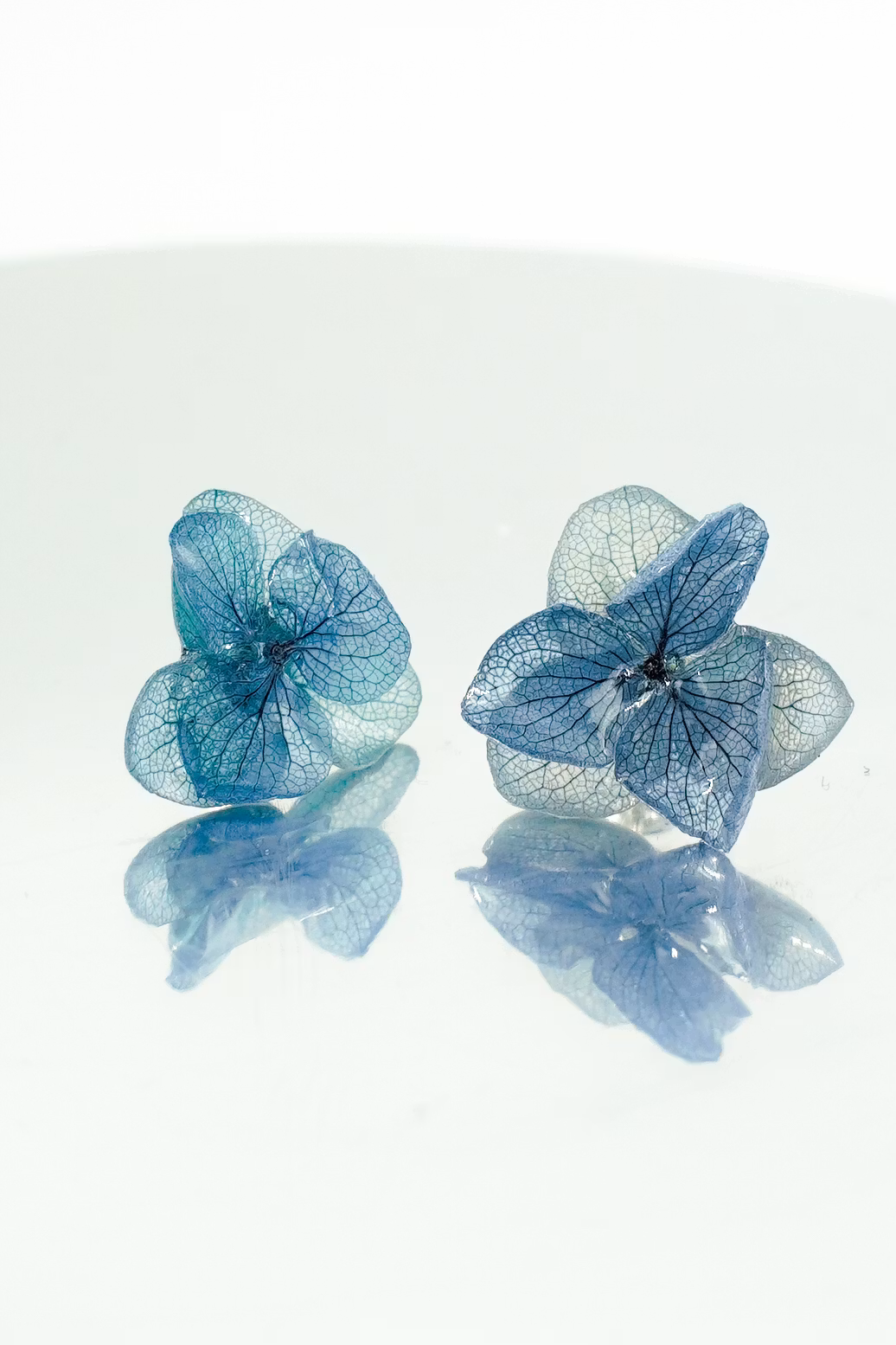 Disse øresmykkene er laget av ekte hortensiablomster, preservert i UV-resin og montert på allergivennlige ørestikker belagt med ekte sølv. Minor er en mindre variant i Hortensia Alv-serien, laget av små hortensiablomster, og har et lett og diskret uttrykk. Resinen gir blomstene glans og fremhever detaljene i hver enkelt.