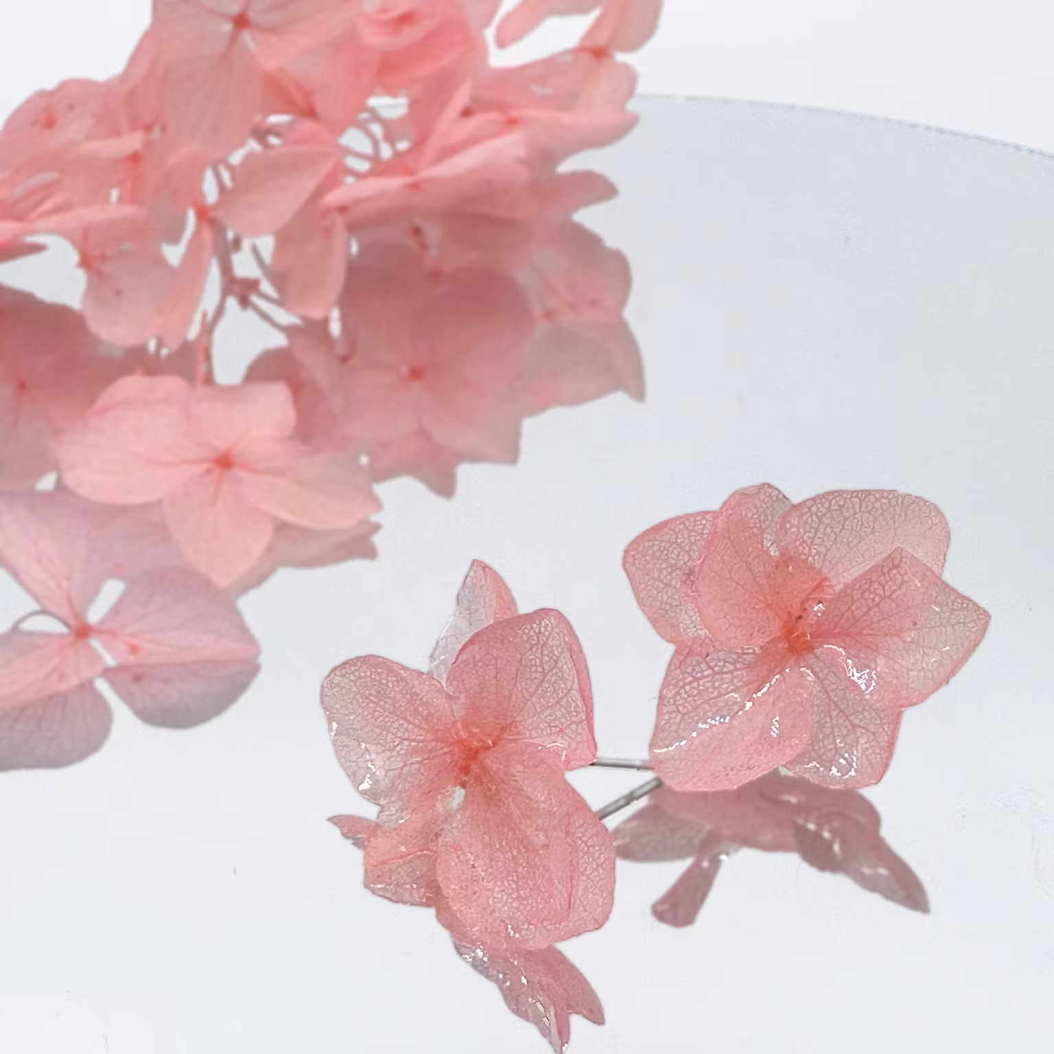 Disse øresmykkene er laget av ekte hortensiablomster, preservert i UV-resin og montert på allergivennlige ørestikker belagt med ekte sølv. Resinen gir blomstene glans og fremhever detaljene i hver enkelt.