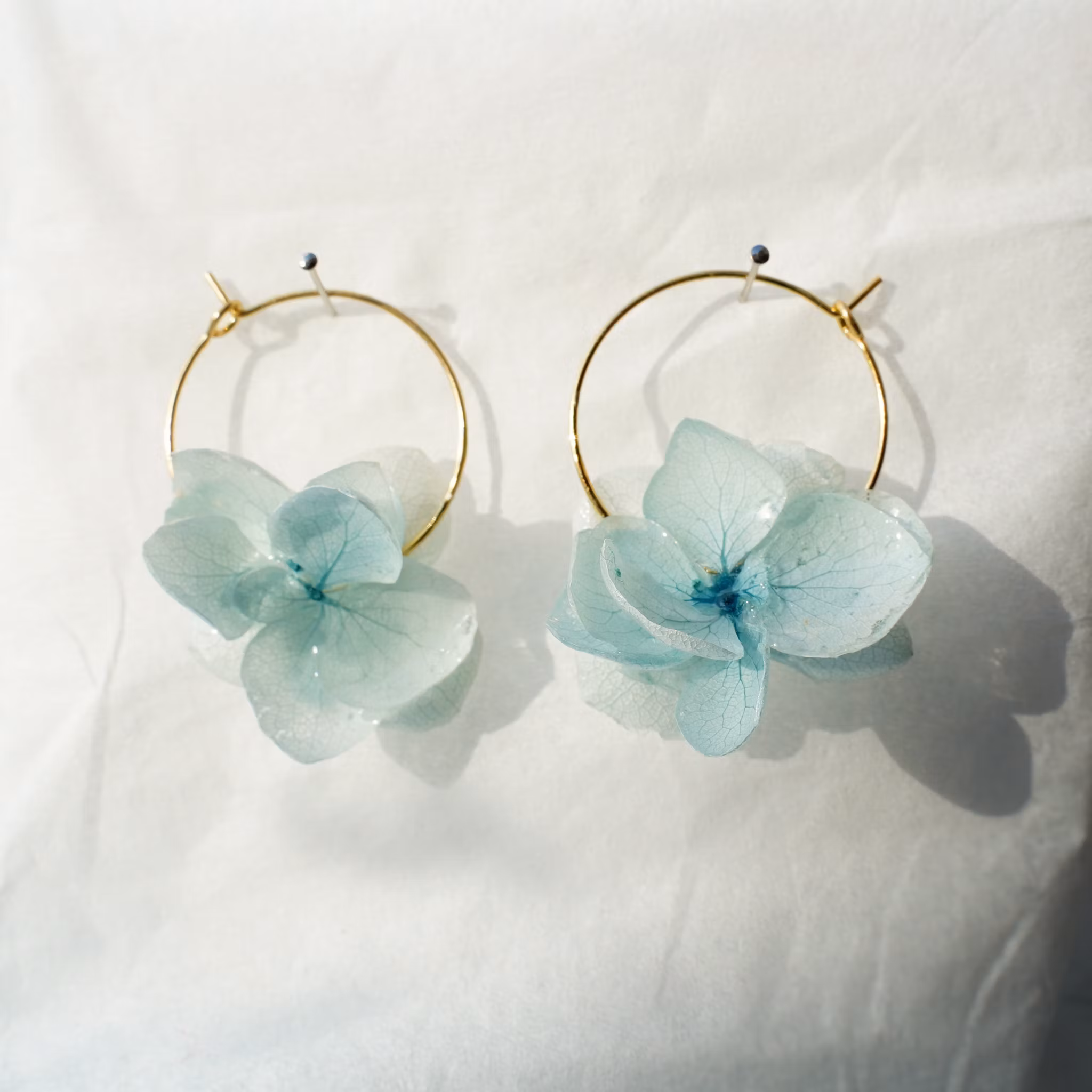 Hortensia Pixie er lette, håndlagde øreringer med ekte hortensiablomster, preservert i UV-resin og montert på øreringer i gullbelagt stål.