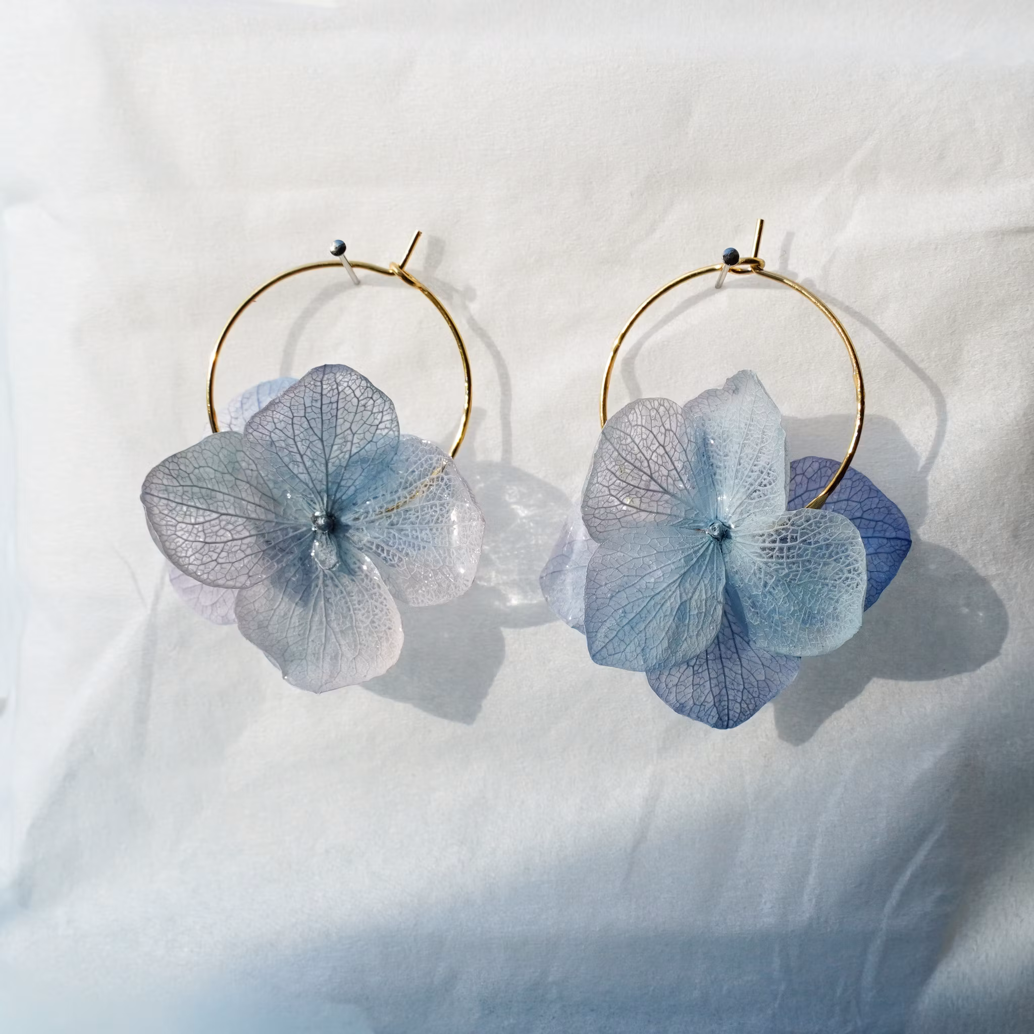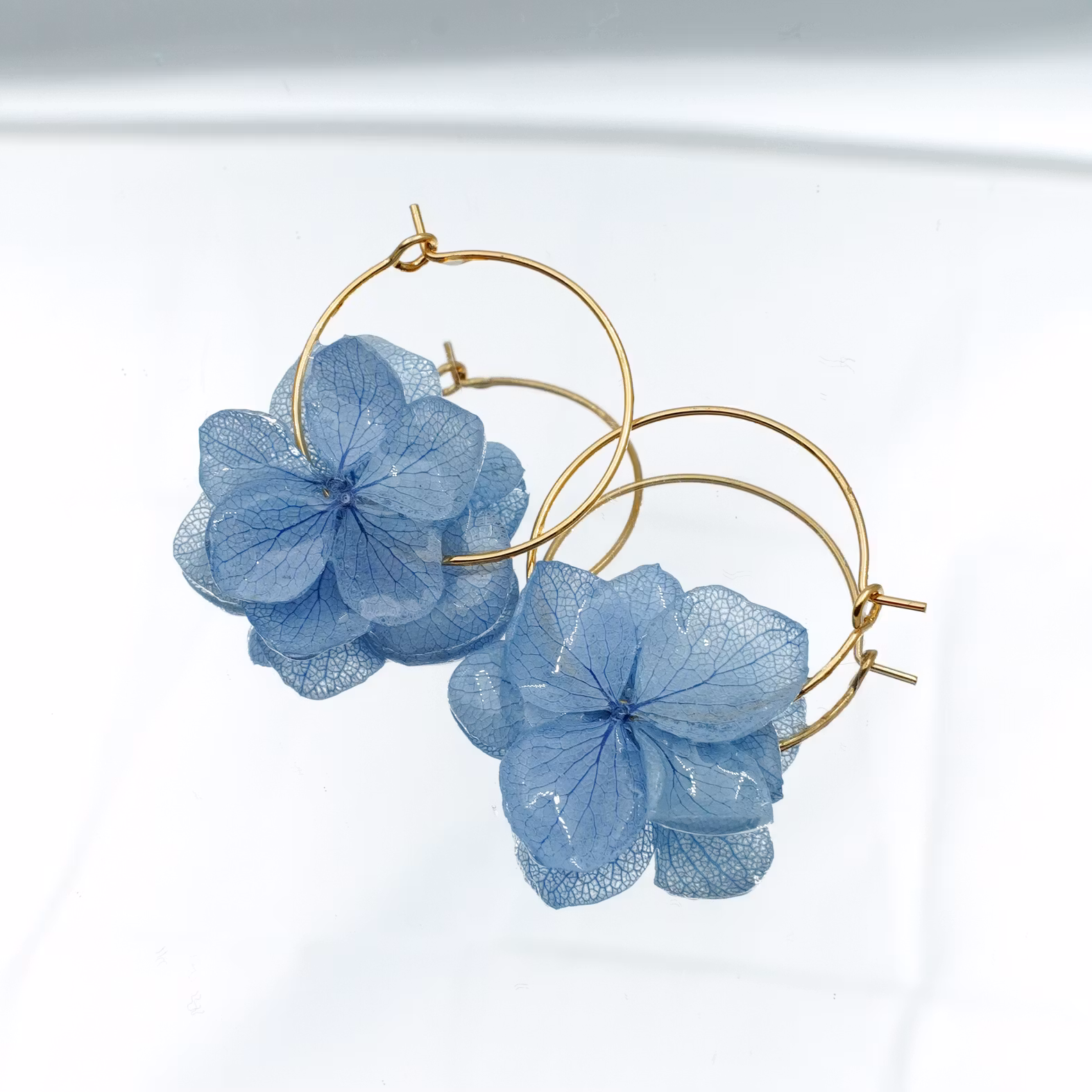 Hortensia Pixie er lette, håndlagde øreringer med ekte hortensiablomster, preservert i UV-resin og montert på øreringer i gullbelagt stål.