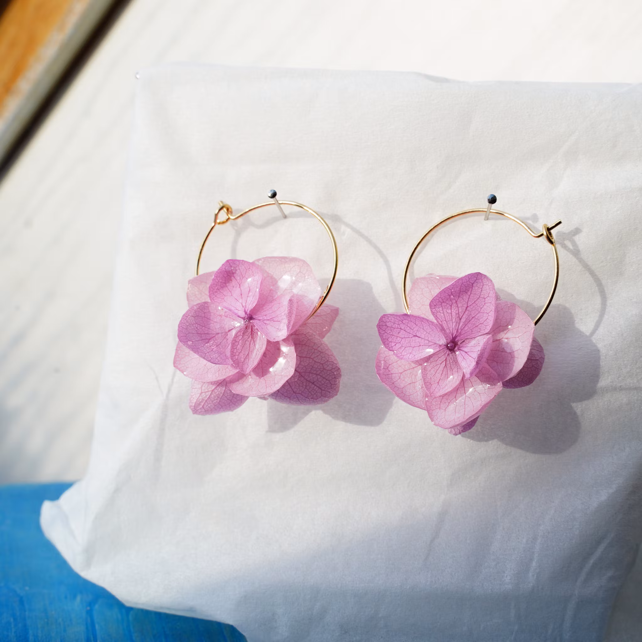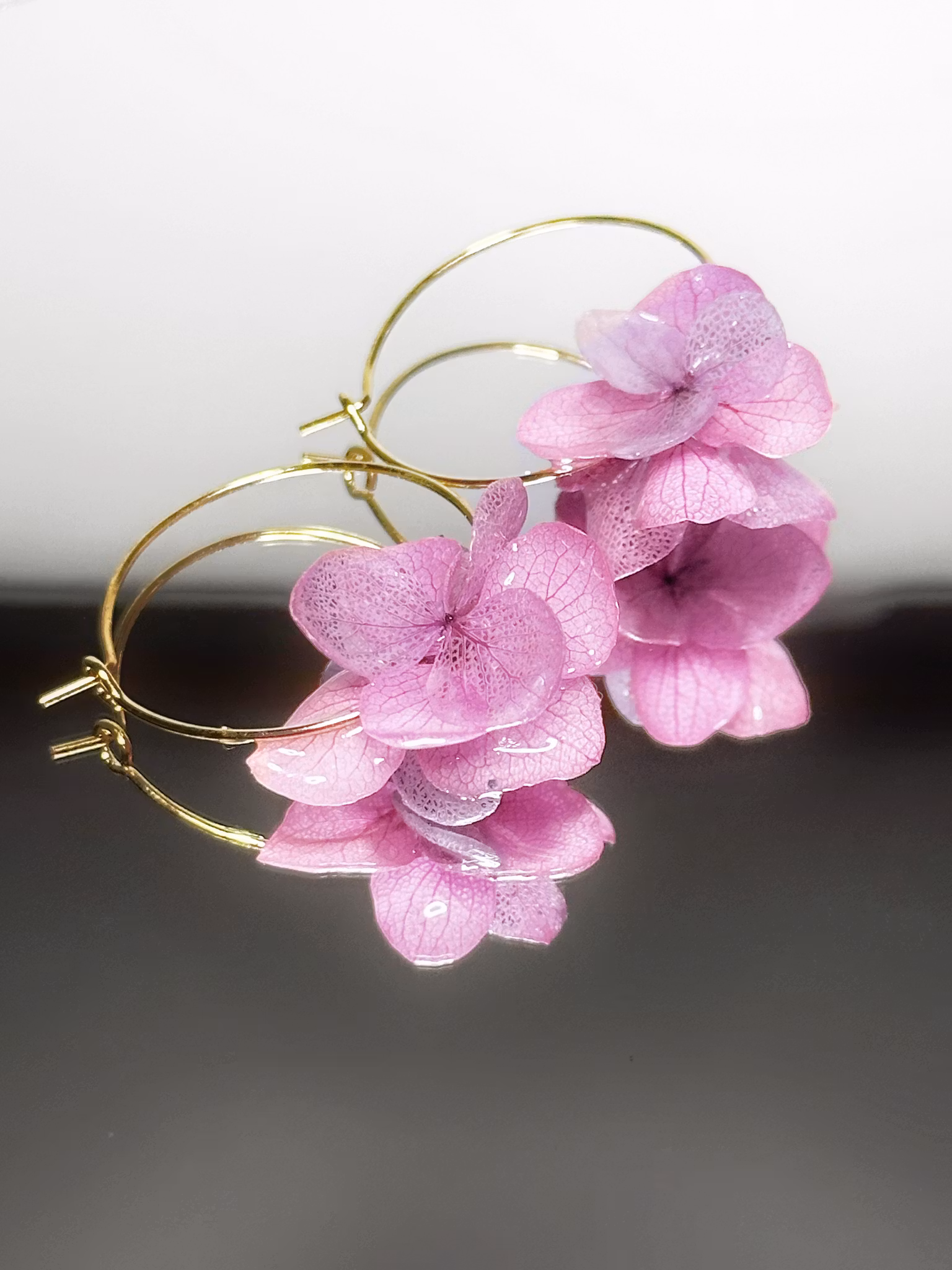 Hortensia Pixie er lette, håndlagde øreringer med ekte hortensiablomster, preservert i UV-resin og montert på øreringer i gullbelagt stål.