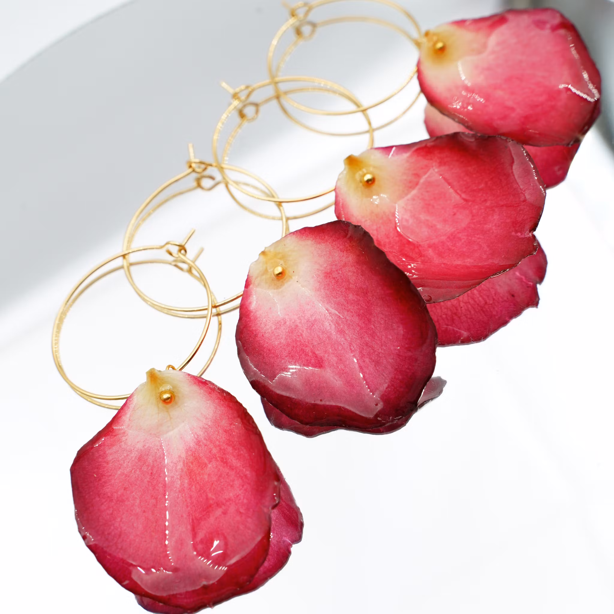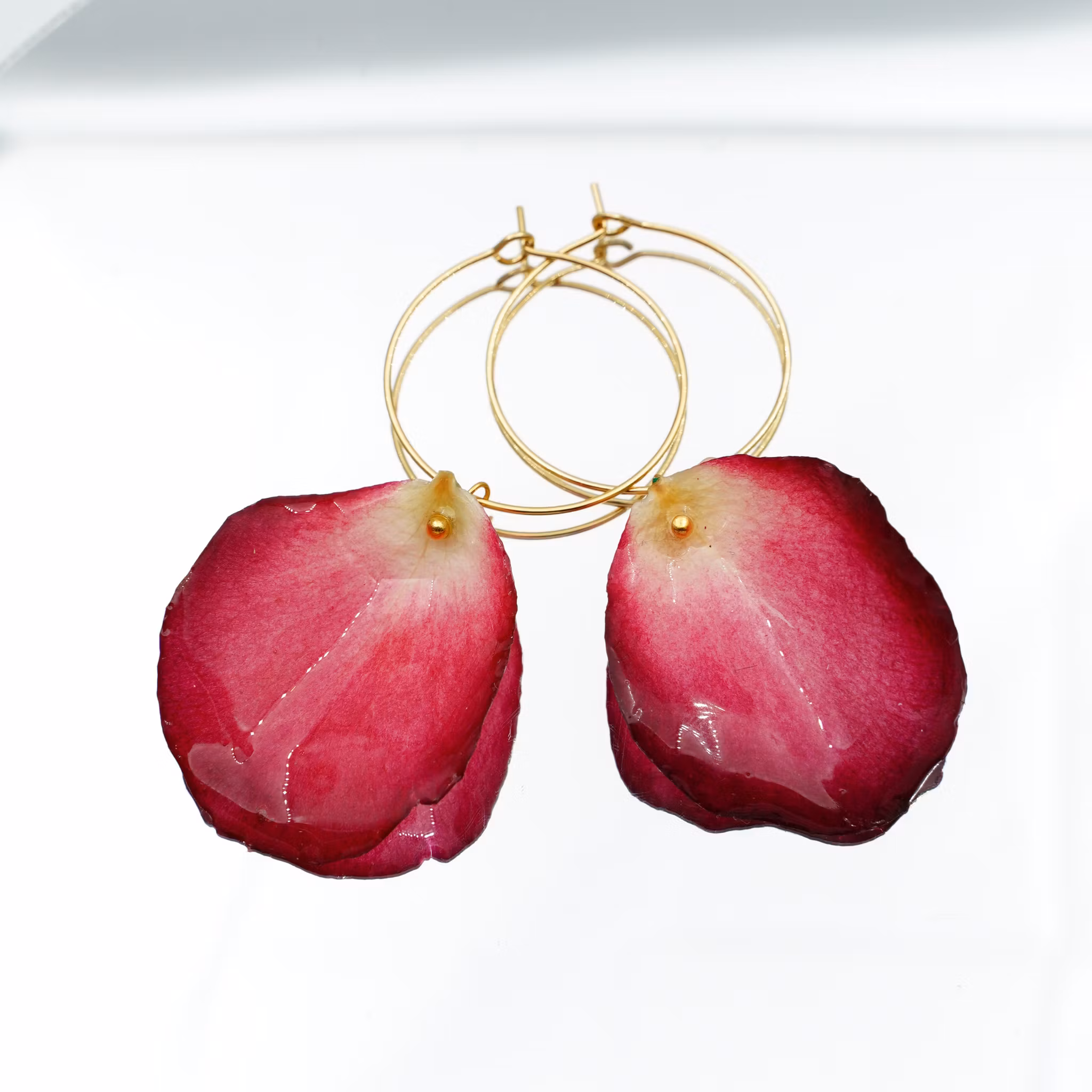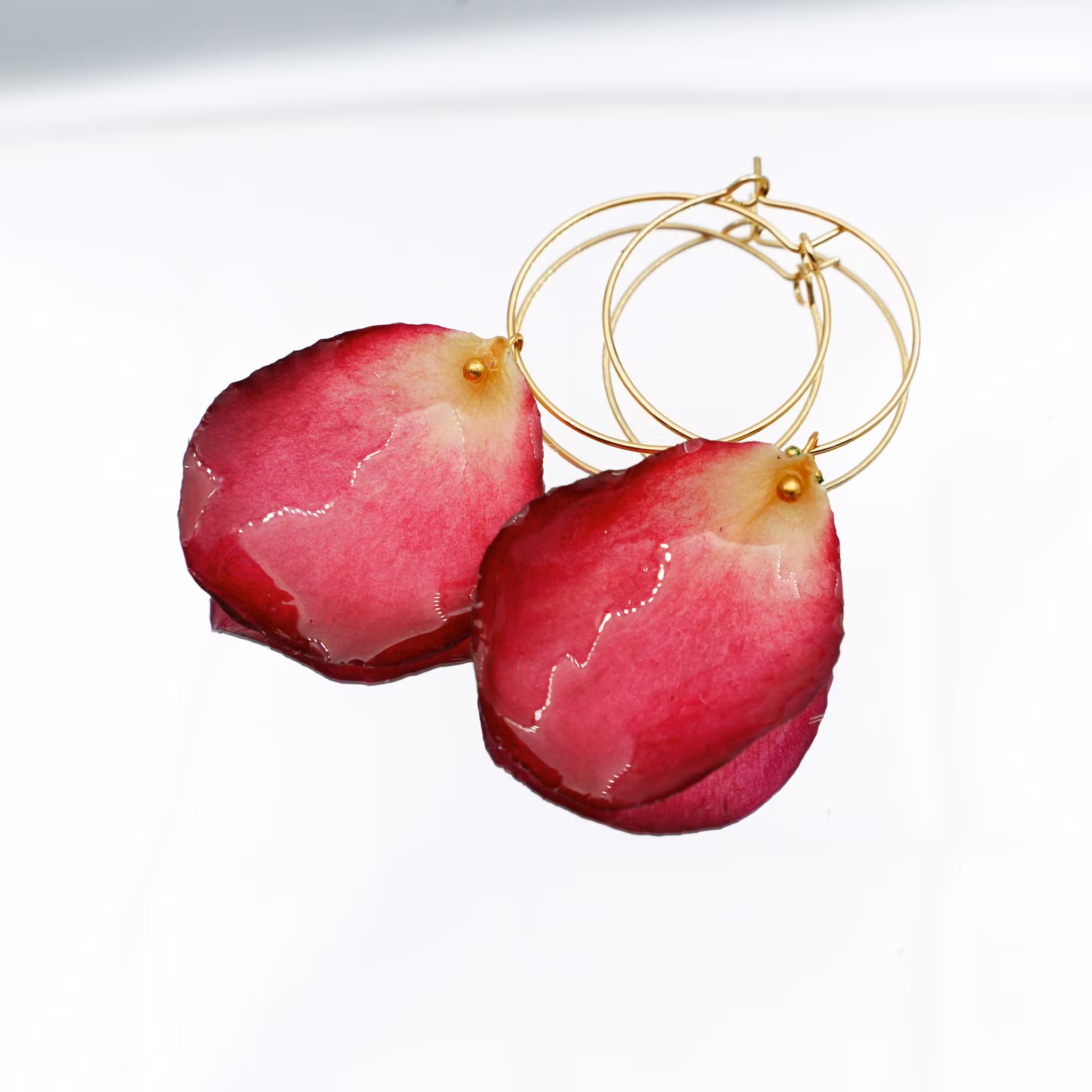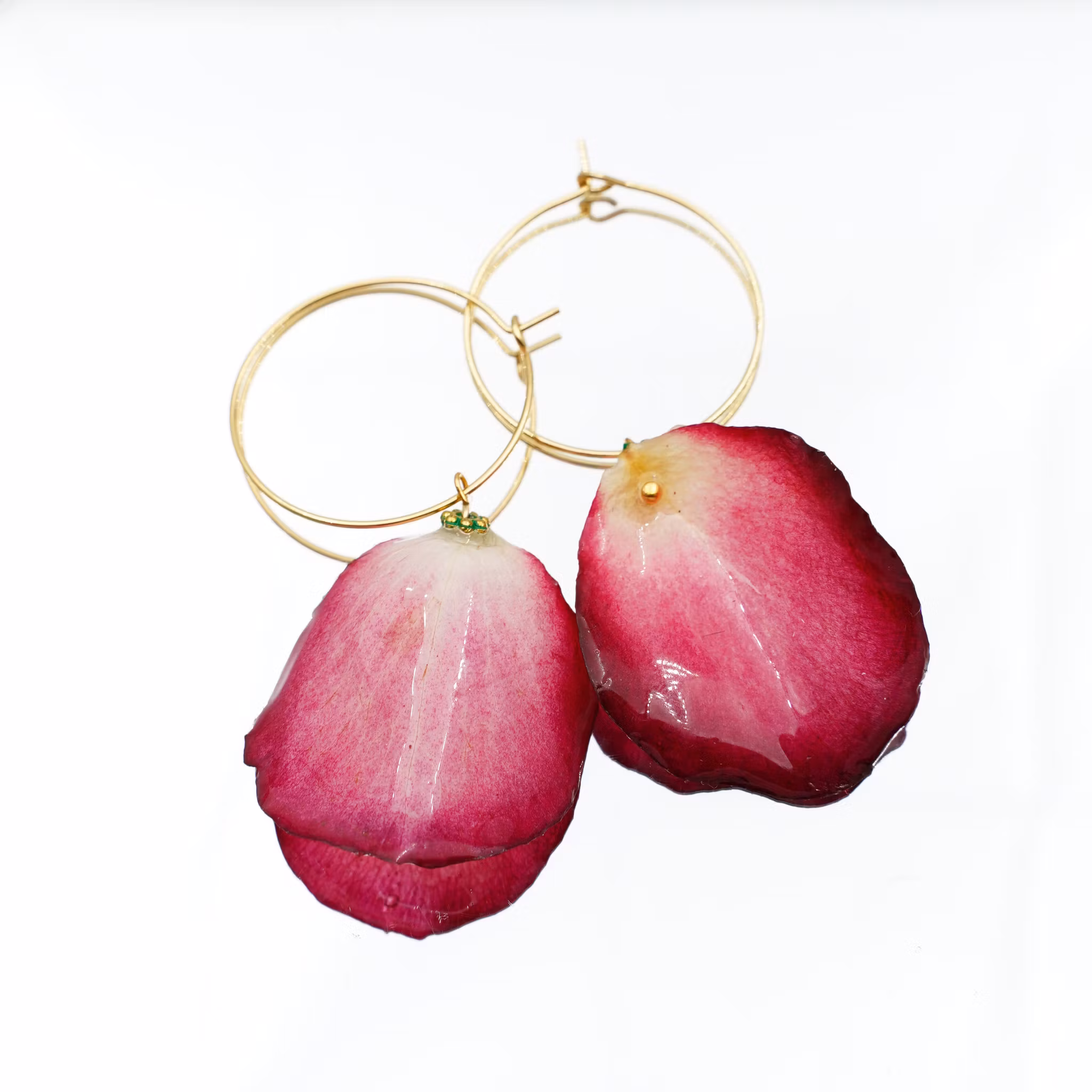 Valkyrierose øreringer er unike smykker laget av ekte roseblader, bevart i UV-herdet resin for en lett, men slitesterk finish. Hvert kronblad har naturlige fargevariasjoner, noe som gjør disse blomsterøredobbene til et helt spesielt tilbehør. Rosebladene er festet med en gullbelagt detalj som fremhever bladets naturlige skjønnhet, og henger fra øreringer belagt med gull.